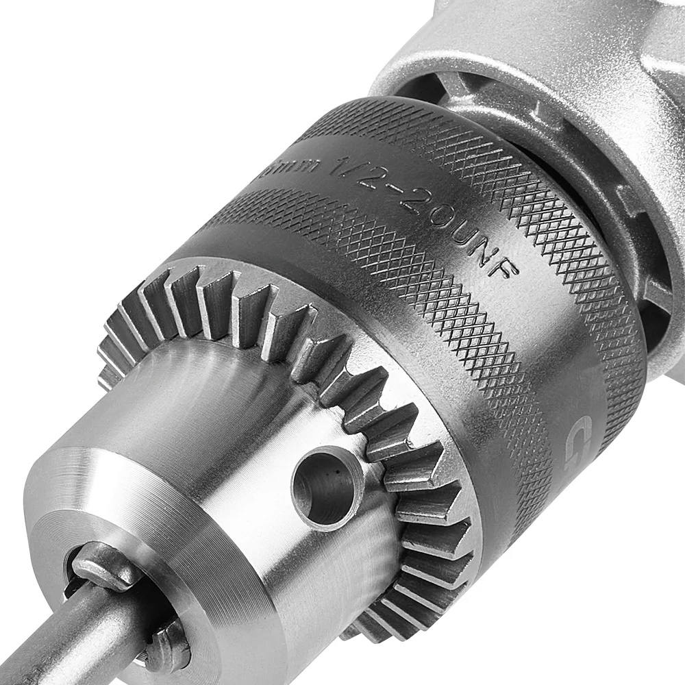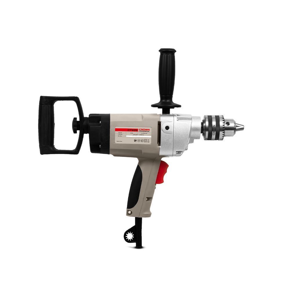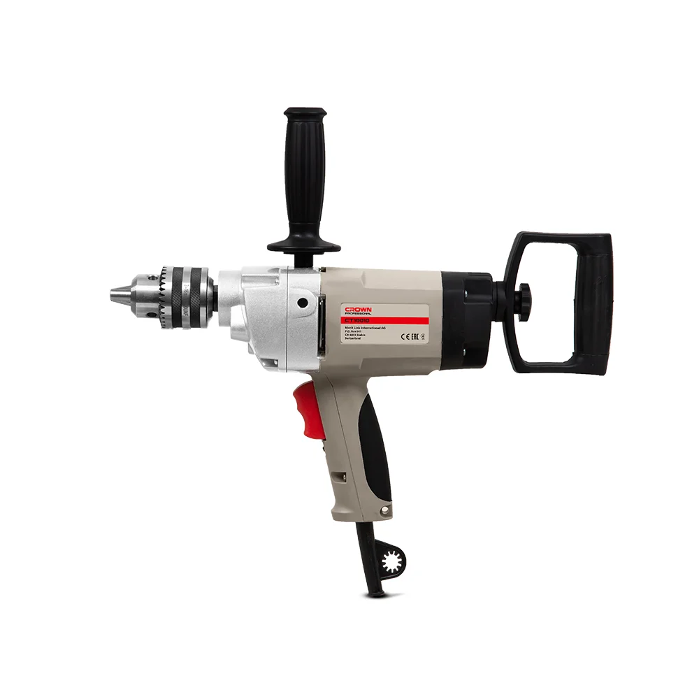 Мощная, безударная, односкоростная, низкооборотная дрель Crown CT10010 для сверления стальных, деревянных и искусственных материалов, а также для перемешивания разнообразных отделочных и строительных смесей. Надёжный корпус редуктора из алюминиевого литья под давлением для быстрого отвода тепла и производительная механика из высококачественного металла. Высокое передаточное число трёхступенчатой механики редуктора для выполнения работ с высокой нагрузкой. Высокий уровень комфорта в работе дрелью Crown CT10010 обеспечивается наличием боковой рукоятки на стальной основе с тремя точками установки, а также поворотной задней D-образной рукояткой. Стальной сверлильный патрон с зубчатым венцом и с тремя мощными зажимными кулачками обеспечивает надежное удержание всей необходимой оснастки. Изменение направления вращения, включение реверса, реализовано одной кнопкой - клавишей выключателя. Для продолжительных режимов работы предусмотрен фиксатор выключателя, но только для режима сверления / перемешивания (направление вращения по часовой стрелке).