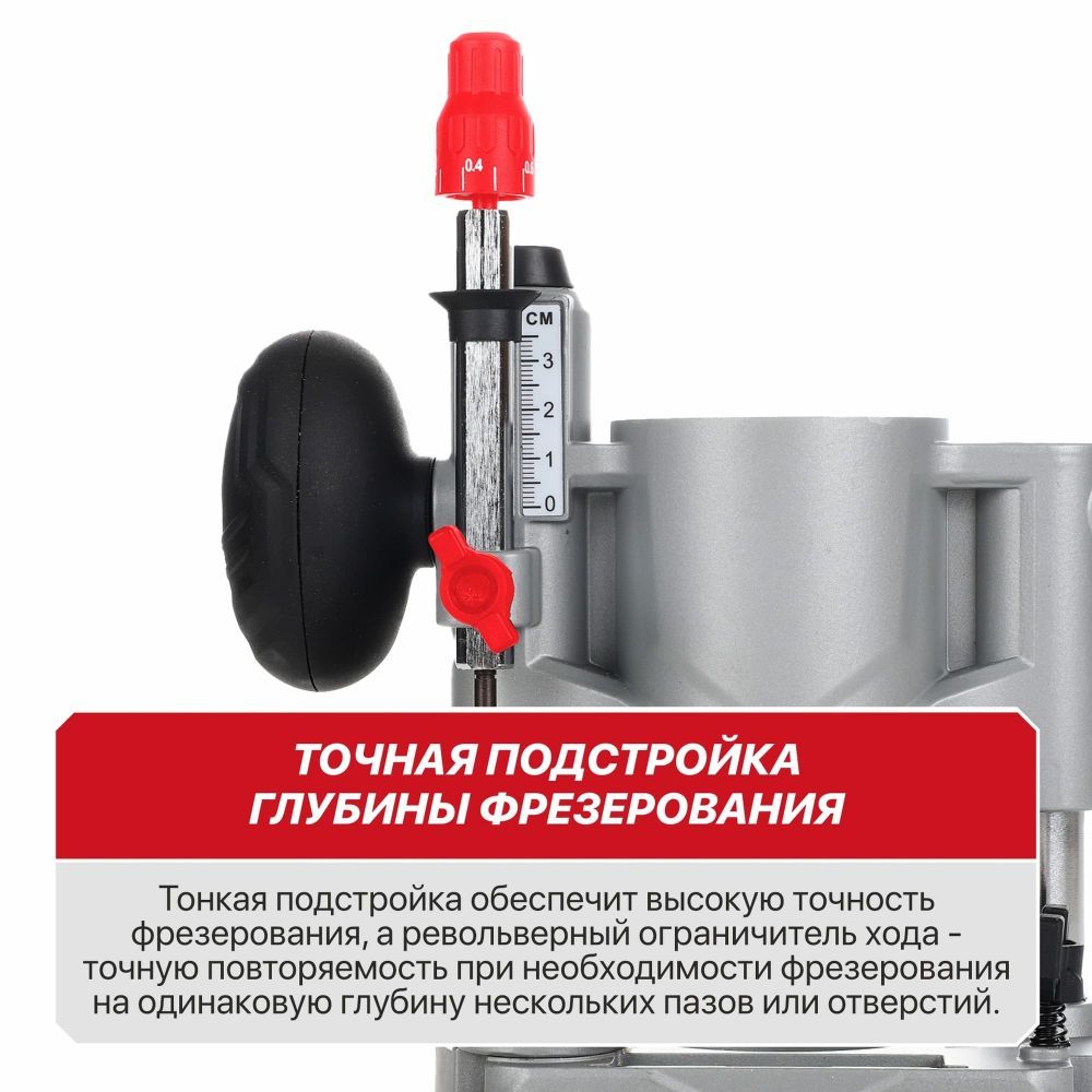 Регулировка глубины фрезерования с фиксацией и тонкой подстройкой обеспечит высокую точность фрезерования, а револьверный ограничитель хода - точную повторяемость при необходимости фрезерования на одинаковую глубину нескольких пазов или отверстий.