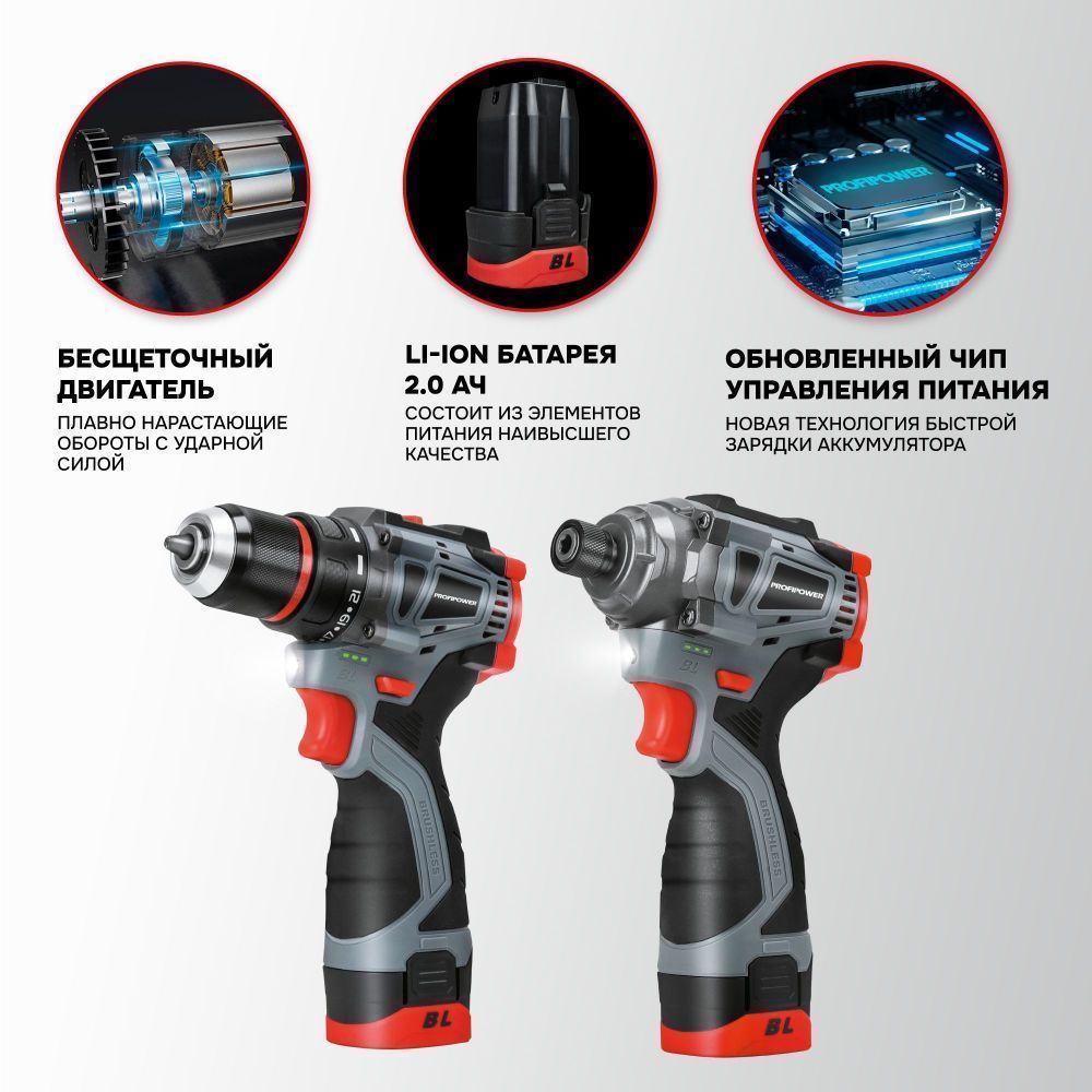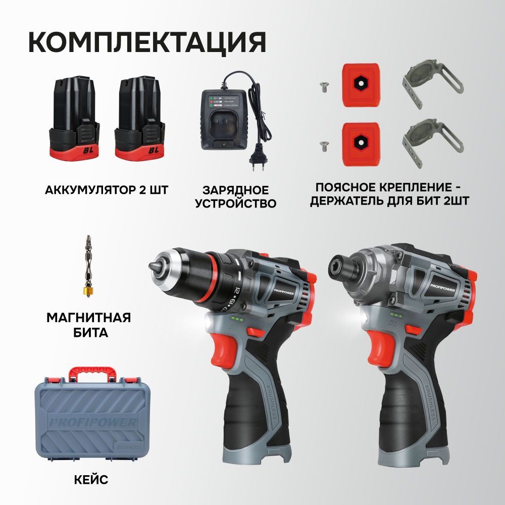 шуруповёрт ProfiPower BL-161 — 1 шт.; винтоверт ProfiPower BL-162 — 1 шт.; аккумулятор — 2 шт.; зарядное устройство — 1 шт.; поясное крепление-держатель для бит — 1 шт.; кейс — 1 шт.; инструкция с гарантийным талоном — 1 шт. |