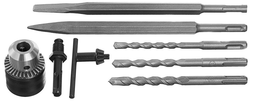 1. Перфоратор – 1шт. 2. Рукоятка дополнительная – 1 шт. 3. Ограничитель глубины сверления - 1 шт. 4. Патрон ЗВП – 1шт. 5. Адаптер патрона - 1шт. 6. Ключ патрона ЗВП - 1шт. 7. Оснастка рабочая SDS-Plus – 5шт. 8. Кейс - 1шт. 9. Паспорт изделия – 1 шт. |
