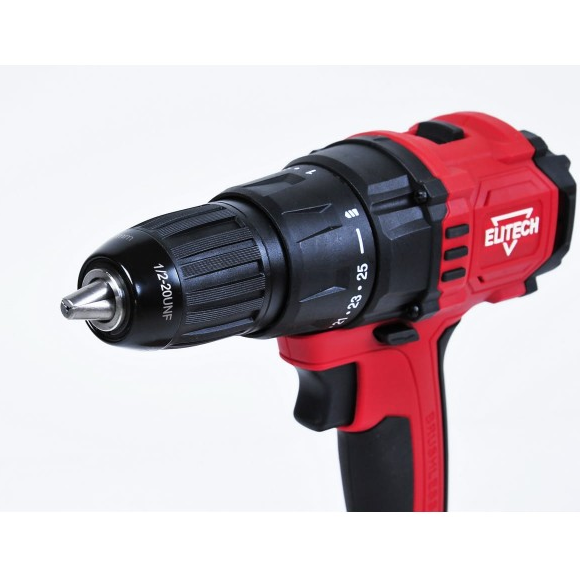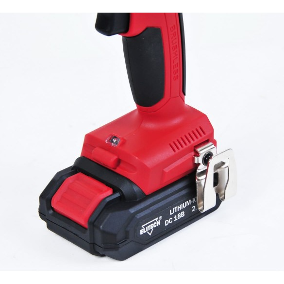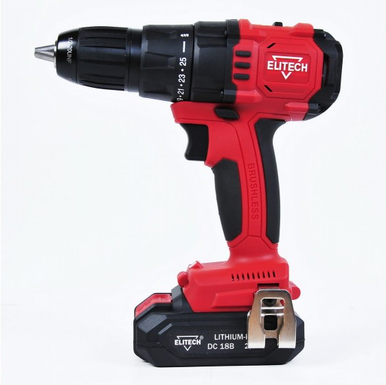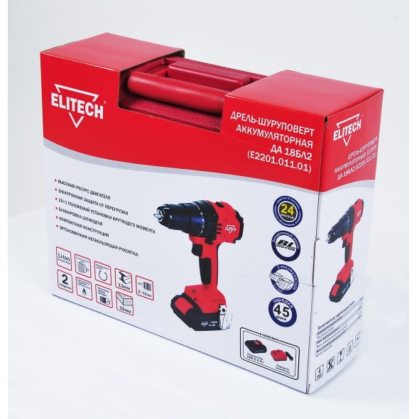 Аккумуляторная дрель-шуруповерт ELITECH ДА 18БЛ2 ( E2201.011.01) с бесщеточным двигателем предназначена для установки крепежа, сверления отверстий в черных и цветных металлах, дереве и производных материалов на его основе (фанера, ДСП, OSB, МДФ и подобные), а также различных видов пластика. Бесщеточный двигатель имеет высокий ресурс (минимум в 10 раз больше обычного коллекторного двигателя), электронную защиту от перегрузки, более высокий КПД и позволяет произвести больше работы на одном заряде аккумулятора. Двигатель имеет компактный размер, что позволяет уменьшить габариты инструмента и его массу. Дрель имеет две скорости (0-500 и 0-2000 об/мин), реверс, муфту ограничения крутящего момента с 25-ю положениями и возможностью отключения (для режима сверления). Патрон бесключевой, одномуфтовый, с диапазоном зажима от 2 до 13 мм. Для управления патроном одной рукой дрель имеет автоматическую блокировку шпинделя. Эргономичная рукоятка имеет накладки для предотвращения проскальзывания в руке. Резиновые вставки на корпусе удерживают инструмент на наклонной плоскости и защищают поверхность, на которую кладут дрель, от возможного повреждения корпусом дрели. Имеется светодиодная подсветка, скоба подвеса на ремень и индикатор уровня заряда аккумулятора (на корпусе дрели). Шестерни в редукторе выполнены из стали.