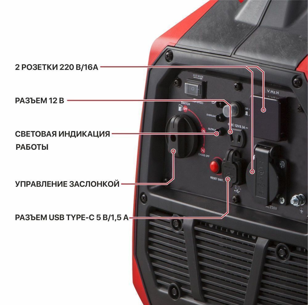 ● Инверторный преобразователь обеспечивает стабильный ток без скачков и искажений с ровной синусоидой● Переключатель холостого хода - экономия топлива и работа в энергосберегающем режиме для оборудования с низким энергопотреблением
