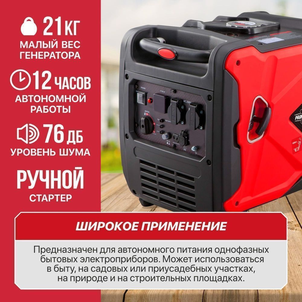 Инверторный бензиновый генератор PGE4500-G предназначен для автономного питания однофазных бытовых электроприборов. Может использоваться в быту, на садовых или приусадебных участках, на природе и на строительных площадках. Инверторный преобразователь обеспечивает стабильный ток без скачков и искажений с ровной синусоидой, что необходимо при подключении цифровых устройств и бытовой техники, которая управляется электронными схемами.