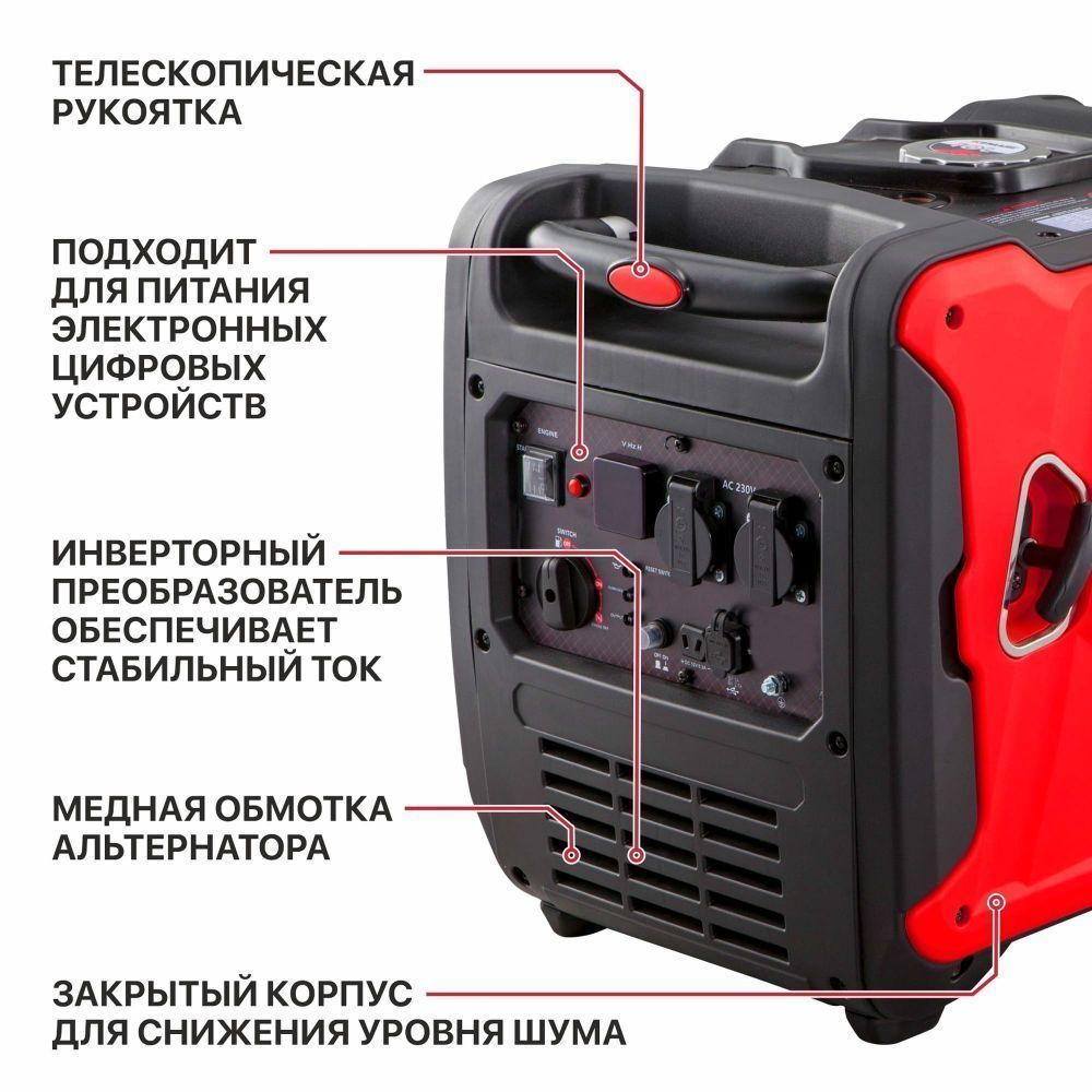 Генератор оборудован автоматическим выключателем для защиты от перегрузки и от работы с низким уровнем масла. Переключатель оборотов холостого хода позволяет экономить энергию и топливо при подключении оборудования с низким энергопотреблением - генератор переходит в режим энергосбережения, когда не требуется полная мощность.