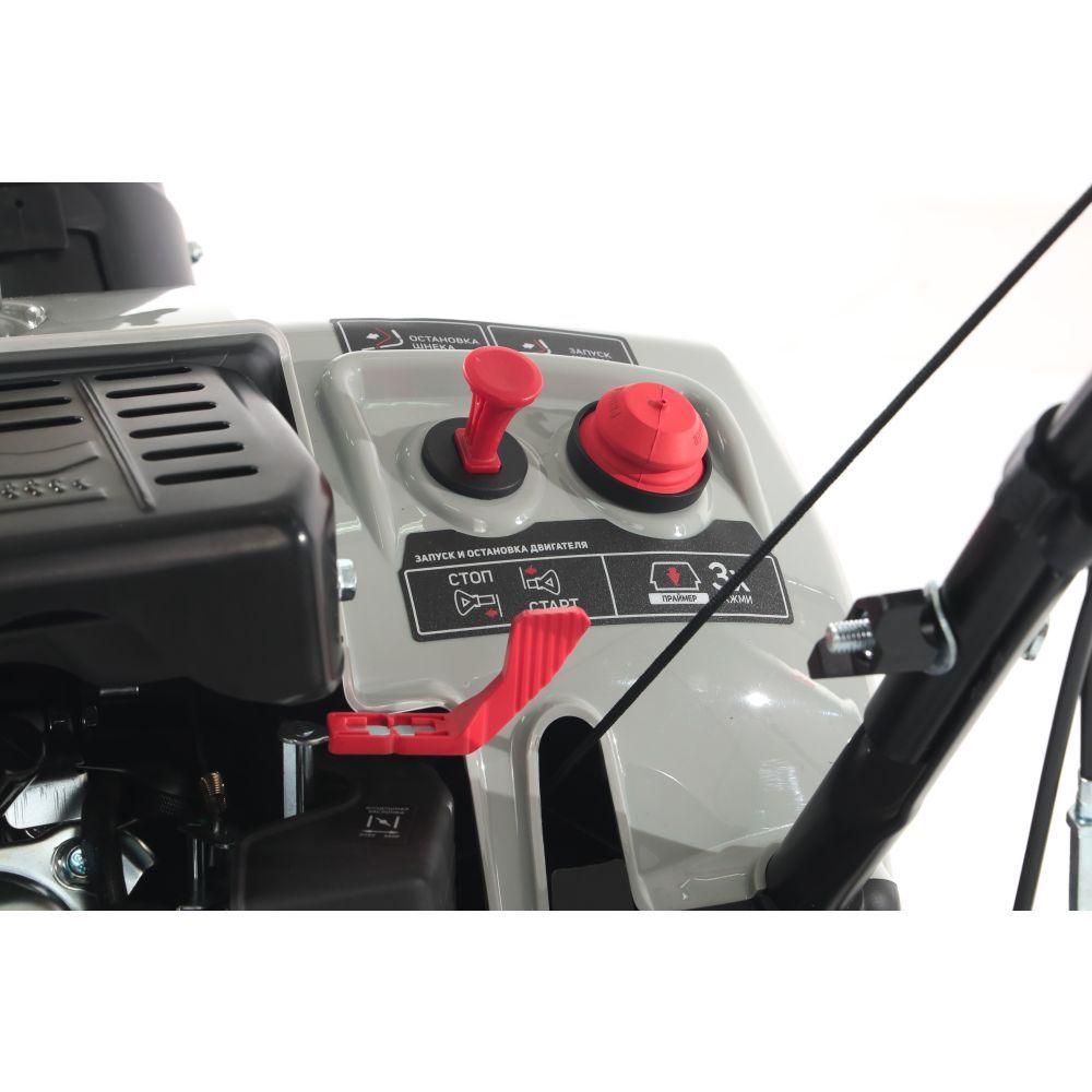 - Уникальная короткоходная кулиса поворотного желоба позволяет легким движением руки мгновенно менять направление выброса снега в диапазоне 190 градусов