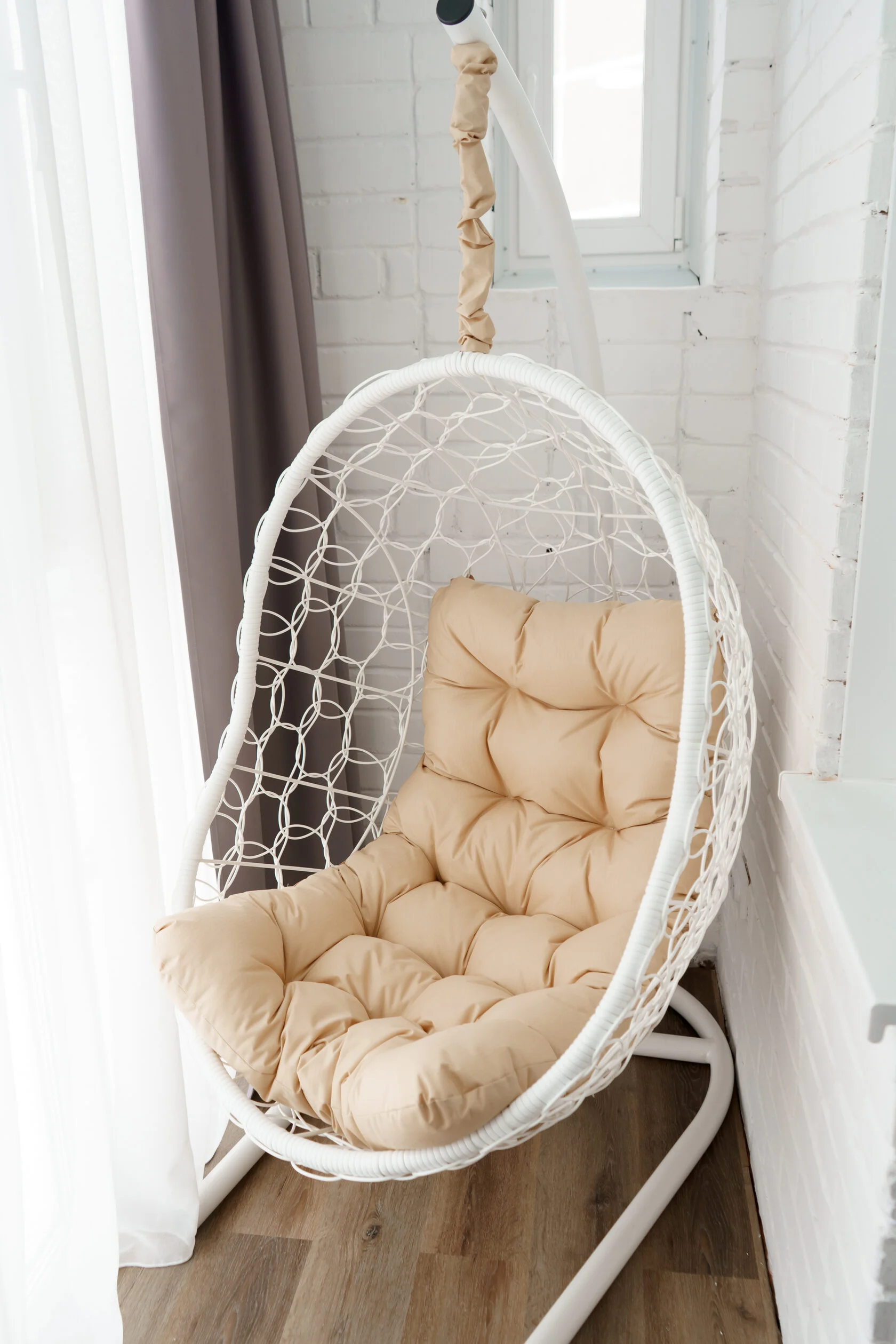 В комплект входит: белое основание и стойка, плетеный кокон, комплект метизов, подушка, чехол на цепь бежевого цвета.