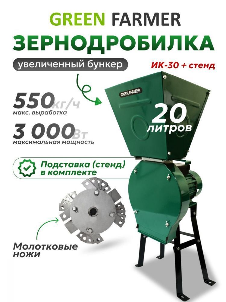 зернодробилка green farmer ик-30 + подставка купить, цена, фото, описание, характеристики, инструкция, отзывы, недорого купить, скидка, официальный сайт, магазин, самара, заказать