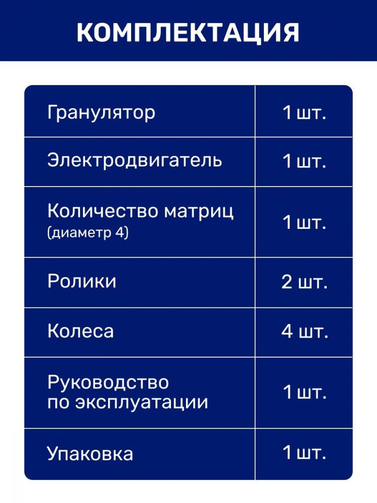 Гранулятор, шт. - 1. Электродвигатель, шт. - 1. Количество матриц, шт. (диаметр отверстий) - 1 (4 мм,) Колеса, шт. - 4. Руководство по эксплуатации, шт. - 1. Упаковка, шт. - 1. |