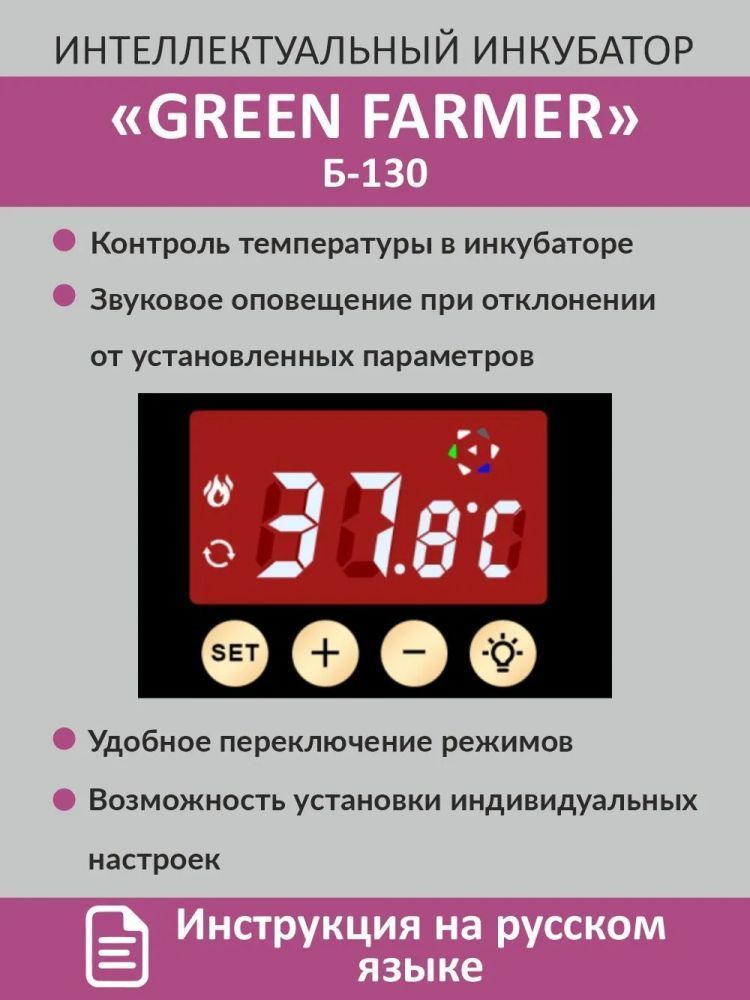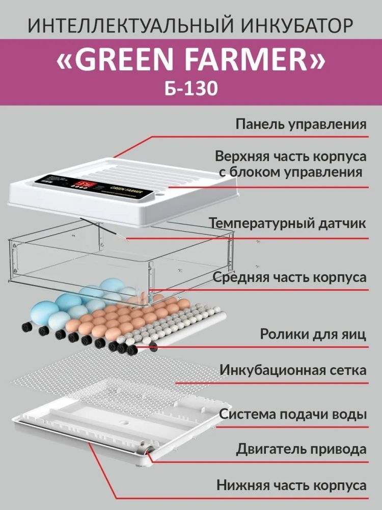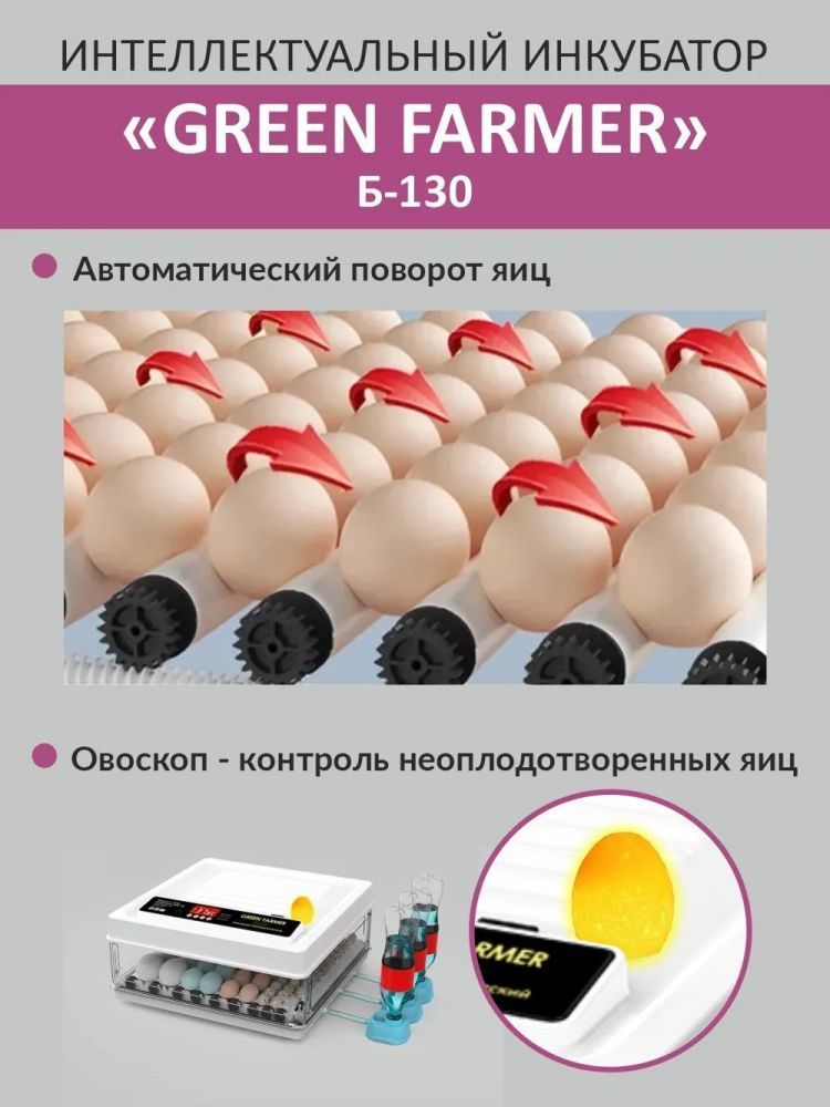 Инкубатор GREEN FARMER З-130 - отличное решение для тех, кто хочет заниматься разведением птиц, будь то начинающий любитель или опытный фермер. С его помощью можно эффективно инкубировать различные виды яиц, включая куриные, перепелиные, утиные, индушиные, гусиные и другие.