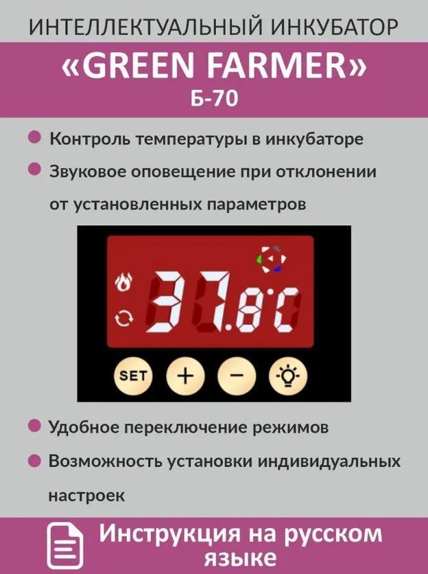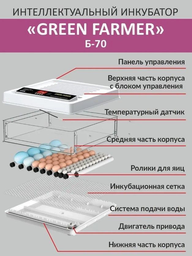 Инкубатор GREEN FARMER Б-70 - отличное решение для тех, кто хочет заниматься разведением птиц, будь то начинающий любитель или опытный фермер. С его помощью можно эффективно инкубировать различные виды яиц, включая куриные, перепелиные, утиные, индушиные, гусиные и другие.