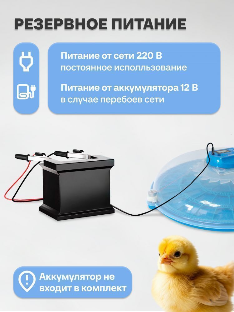 Инкубаторы оснащены автоматической системой управления, которая регулирует температуру внутри корпуса в заданных пределах. Влажность определяется и регулируется вручную, путем долива или изъятия излишка воды. Есть функция автоматического поворота яиц и овоскопирования. Устройство работает от сети 220В или от внешнего аккумулятора с напряжением 12В (в комплект не входит).