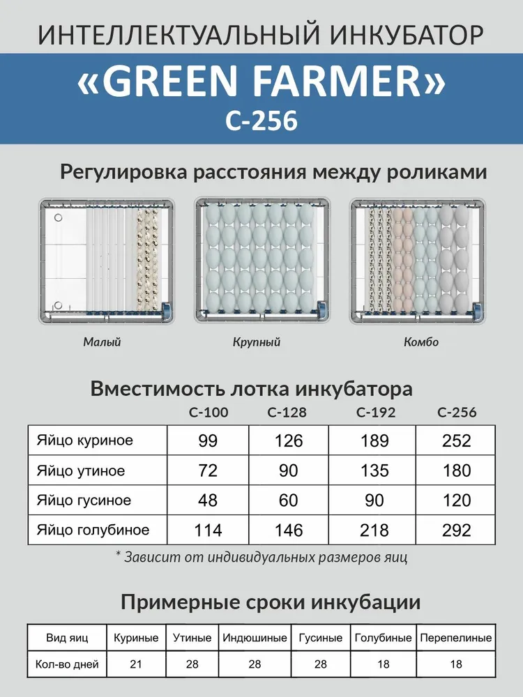 Инкубатор GREEN FARMER С-256 - отличное решение для тех, кто хочет заниматься разведением птиц, будь то начинающий любитель или опытный фермер. С его помощью можно эффективно инкубировать различные виды яиц, включая куриные, перепелиные, утиные, индюшиные, гусиные и другие.