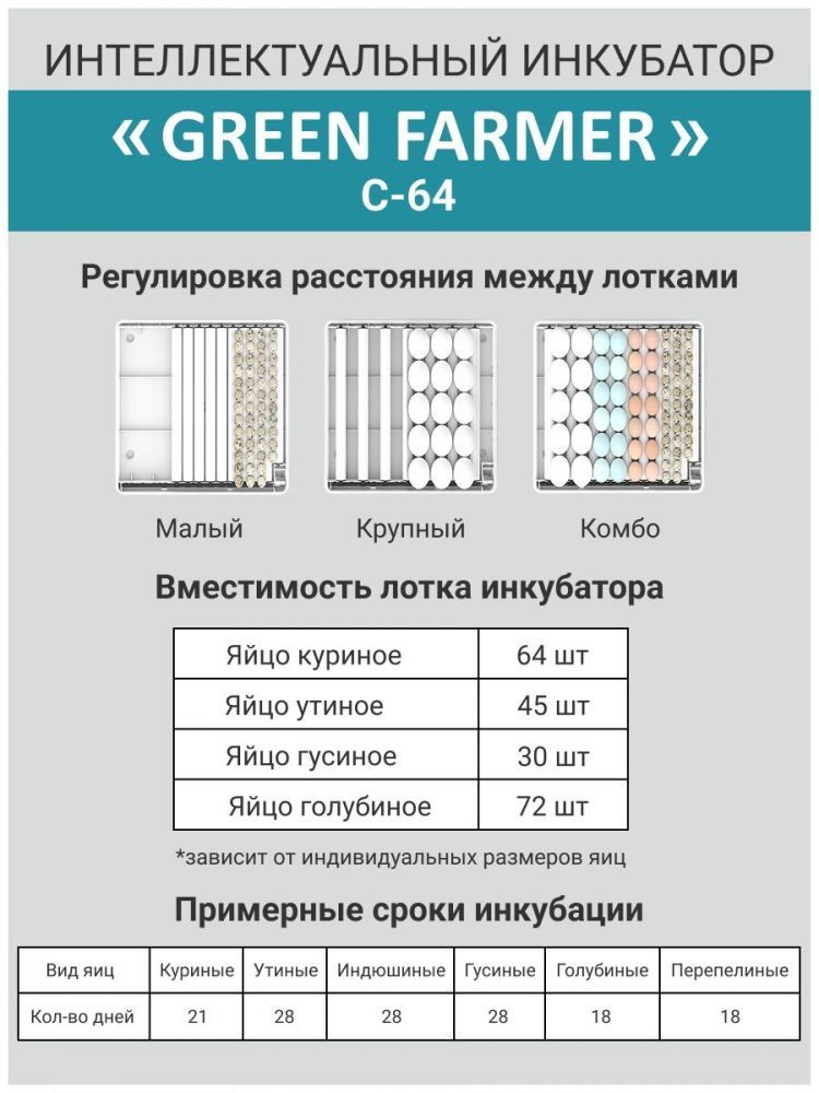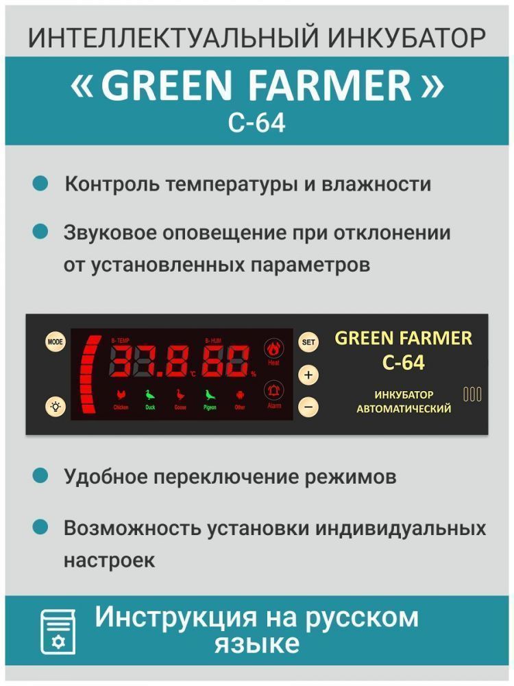 Инкубатор GREEN FARMER С-64 тличное решение для тех, кто хочет заниматься разведением птиц, будь то начинающий любитель или опытный фермер. С его помощью можно эффективно инкубировать различные виды яиц, включая куриные, перепелиные, утиные, индюшиные, гусиные и другие.