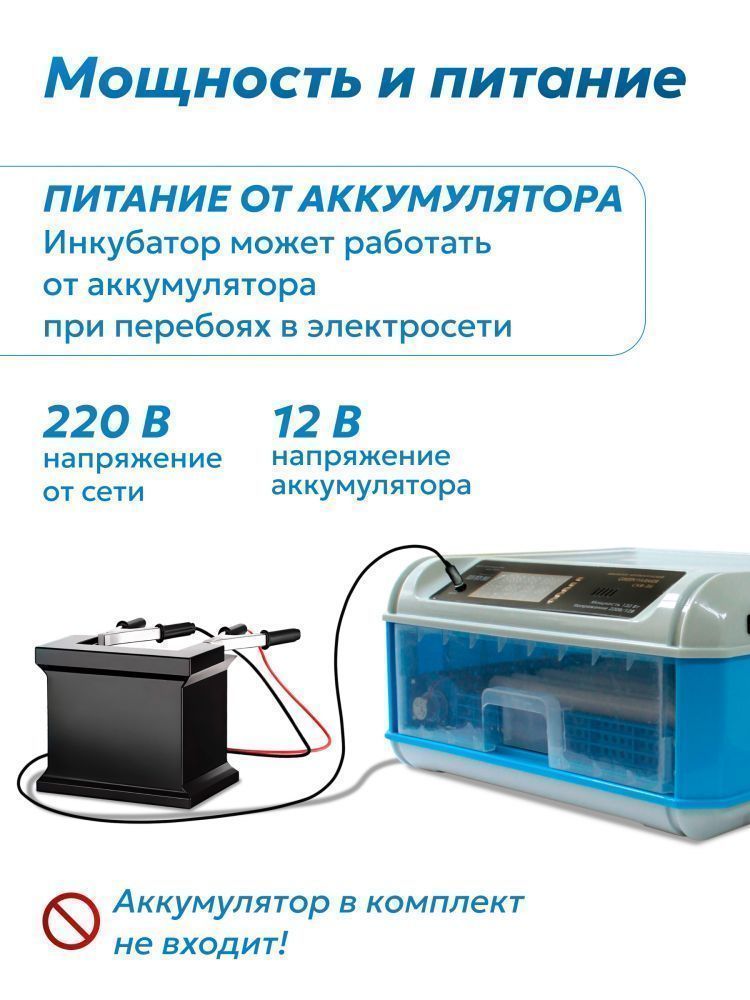 Инкубатор оснащен автоматической системой управления, которая регулирует температуру внутри корпуса в заданных пределах в соответствии с выбранным режимом инкубации. Влажность регулируется вручную, путем долива или изъятия излишка воды. В случае выхода за пределы заданных диапазонов, встроенный звуковой сигнализатор оповещает пользователя. Есть функция автоматического поворота яиц и овоскопирования. Устройство работает от сети 220В или от внешнего аккумулятора с напряжением 12В (в комплект не входит). Возможность выбора расстояния между вращающимися роликами позволяет инкубировать разные виды птичьих яиц: куриные, утиные, гусиные, индюшиные, голубиные, перепелиные, фазаньи.