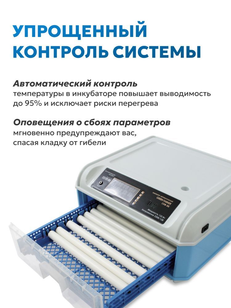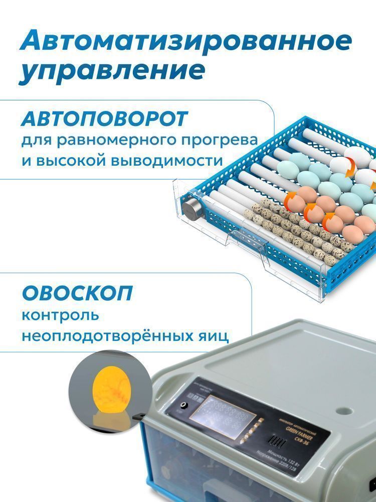 Инкубатор GREEN FARMER СКВ-36 - отличное решение для тех, кто хочет заниматься разведением птиц, будь то начинающий любитель или опытный фермер. С его помощью можно эффективно инкубировать различные виды яиц, включая куриные, утиные, гусиные, индюшиные, голубиные, перепелиные, фазаньи и другие.