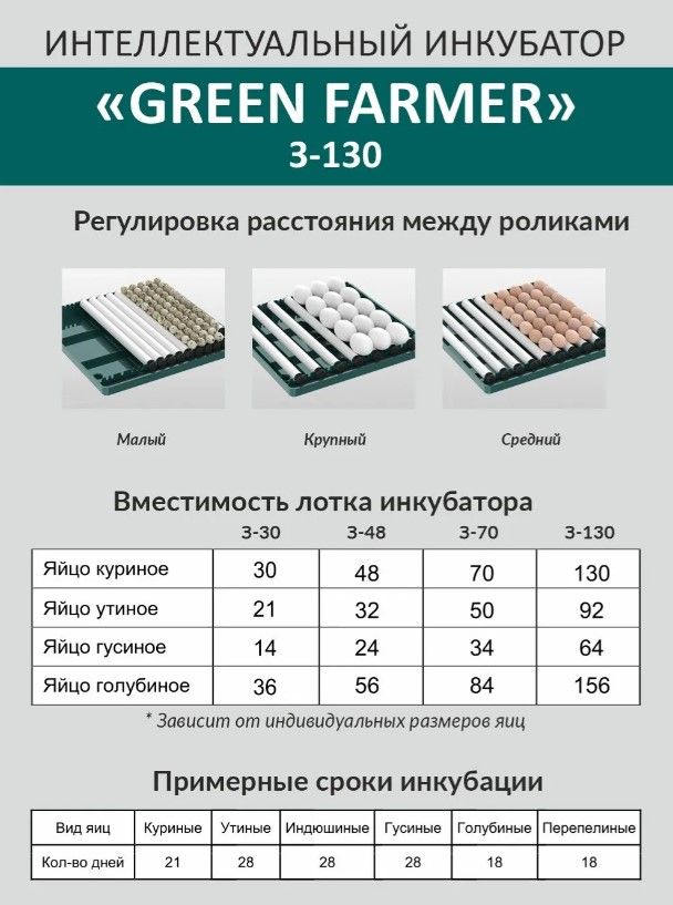 Инкубатор GREEN FARMER З-130 - отличное решение для тех, кто хочет заниматься разведением птиц, будь то начинающий любитель или опытный фермер. С его помощью можно эффективно инкубировать различные виды яиц, включая куриные, перепелиные, утиные, индюшиные, гусиные и другие.