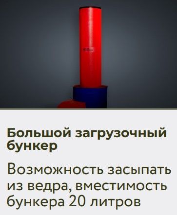 - Большой загрузочный бункер. Возможность засыпать из ведра, вместимость бункера - 20 литров.