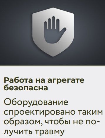 - Работа на агрегате безопасна. Оборудование спроектировано таким образом, чтобы работающий не получил травму.