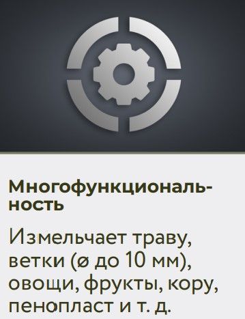 - Многофункциональность. Измельчает траву, ветки (диам. до 10 мм), овощи, фрукты, кору, пенопласт и т.д..