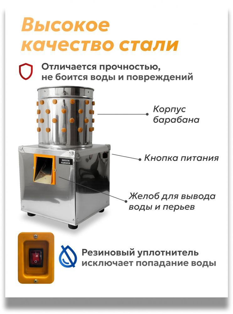 Перосъемная электрическая машина GREEN FARMER GF-300 используется для ощипывания кур, индеек, уток, гусей и другой домашней и дикой птицы. Машина легка в использовании, производительна, а главное позволяет экономить время птицевода. Работает машина по принципу центрифуги, рабочими органами которой являются резиновые пальцы. Применение специальных перосъемных (бильных) пальцев позволяет избежать повреждения кожи птицы. Корпус машины и барабан выполнены из нержавеющей стали, что обеспечивает долговечность и гигиеничность использования.