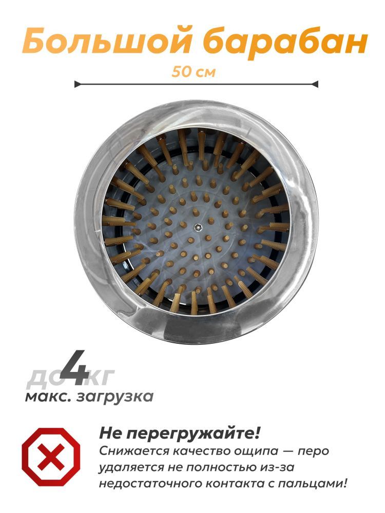 Перосъемная электрическая машина GREEN FARMER GF-500 используется для ощипывания кур, индеек, уток, гусей и другой домашней и дикой птицы. Машина легка в использовании, производительна, а главное позволяет экономить время птицевода. Работает машина по принципу центрифуги, рабочими органами которой являются резиновые пальцы. Применение специальных перосъемных (бильных) пальцев позволяет избежать повреждения кожи птицы. Корпус машины и барабан выполнены из нержавеющей стали, что обеспечивает долговечность и гигиеничность использования.