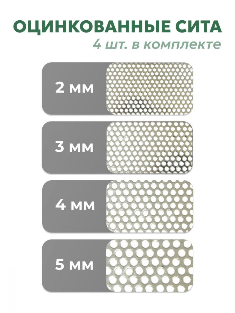 - 4 вида сито с диаметром отверстий: 2, 3, 4, 5 мм,