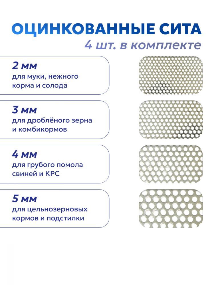 - 4 вида сито с диаметром отверстий: 2, 3, 4, 5 мм,