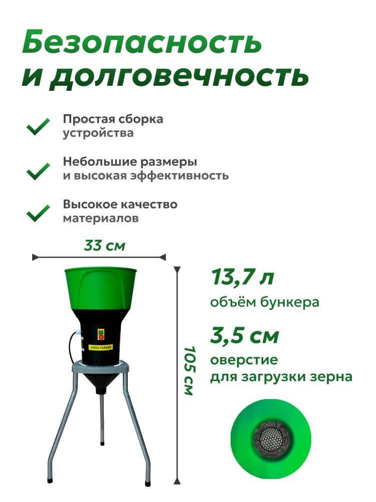 Электрическая зернодробилка GREEN FARMER ЗД 400Т предназначена для измельчения зерна для кормления кур, коров или свиней. В качестве сырья возможно использование следующих растительных культур: пшеницы, ячменя, ржи, проса, кукурузы, риса. Модель имеет в комплекте ножки, которые с помощью крепежа крепятся к основанию зернодробилки. Для сбора продуктов помола под зернодробилкой используйте подходящую емкость или мешок (в комплект не входит). Для равномерного выхода продуктов помола используйте нижнюю воронку (в комплекте у данных моделей).