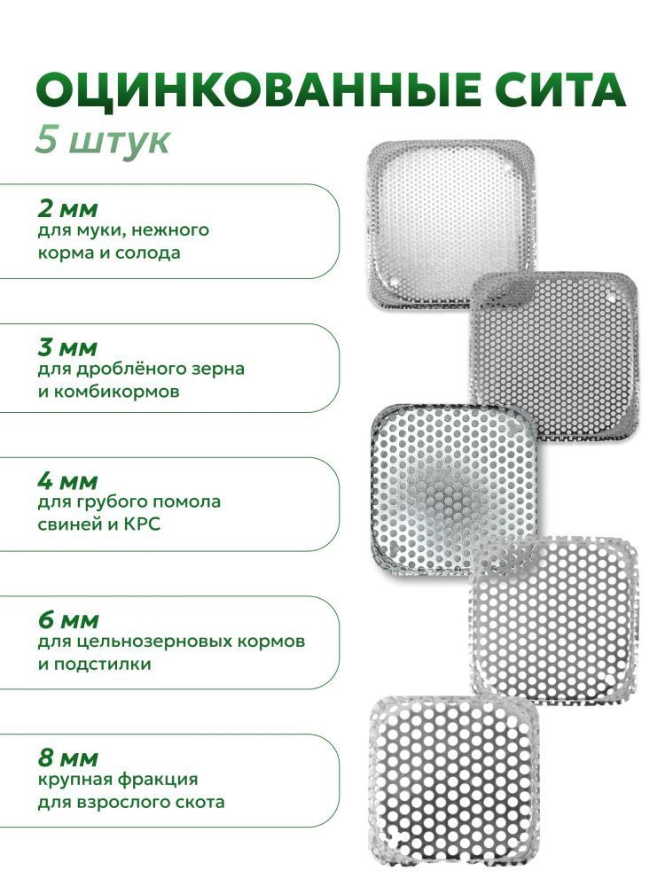 В комплекте 5 видов сито с диаметром отверстий (1 установлено + 4 в запасе): 2, 3, 4, 6, 8 мм.Технические характеристики (максимальные величины)