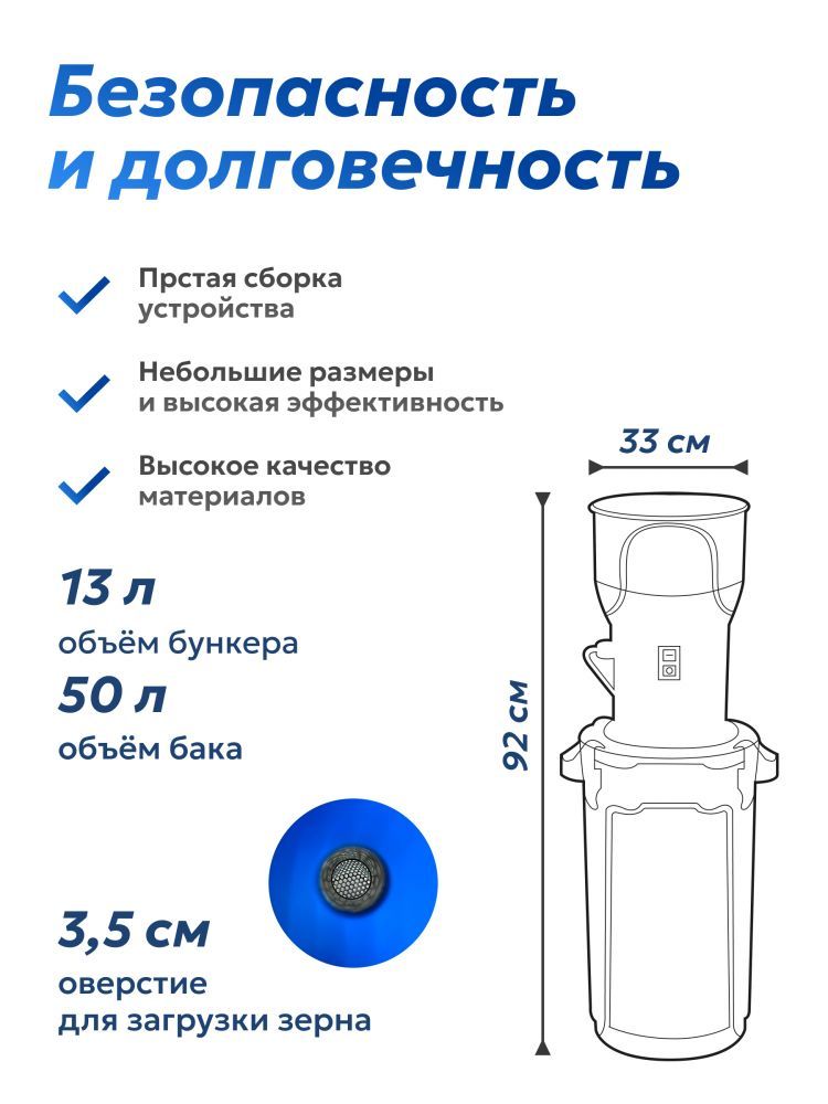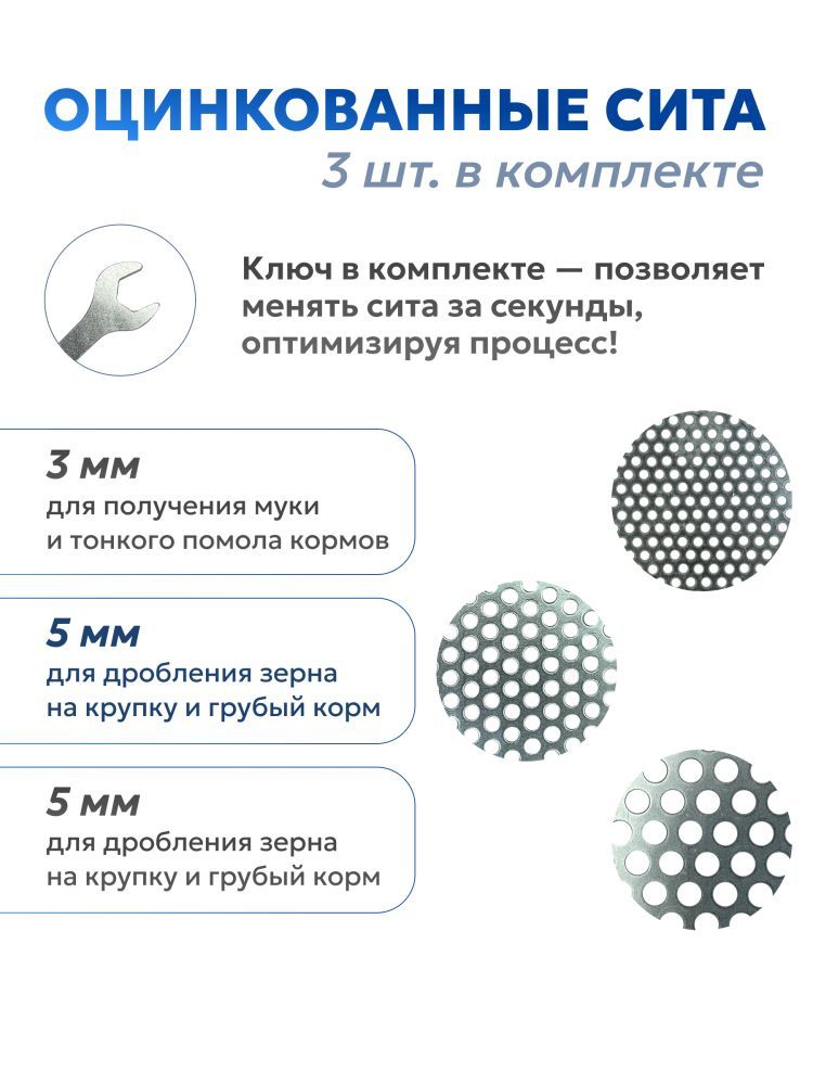 Электрическая зернодробилка SteadFast ИЗЭ-300/50 предназначена для измельчения зерна для кормления кур, коров или свиней. В качестве сырья возможно использование следующих растительных культур: пшеницы, ячменя, ржи, проса, кукурузы, риса.